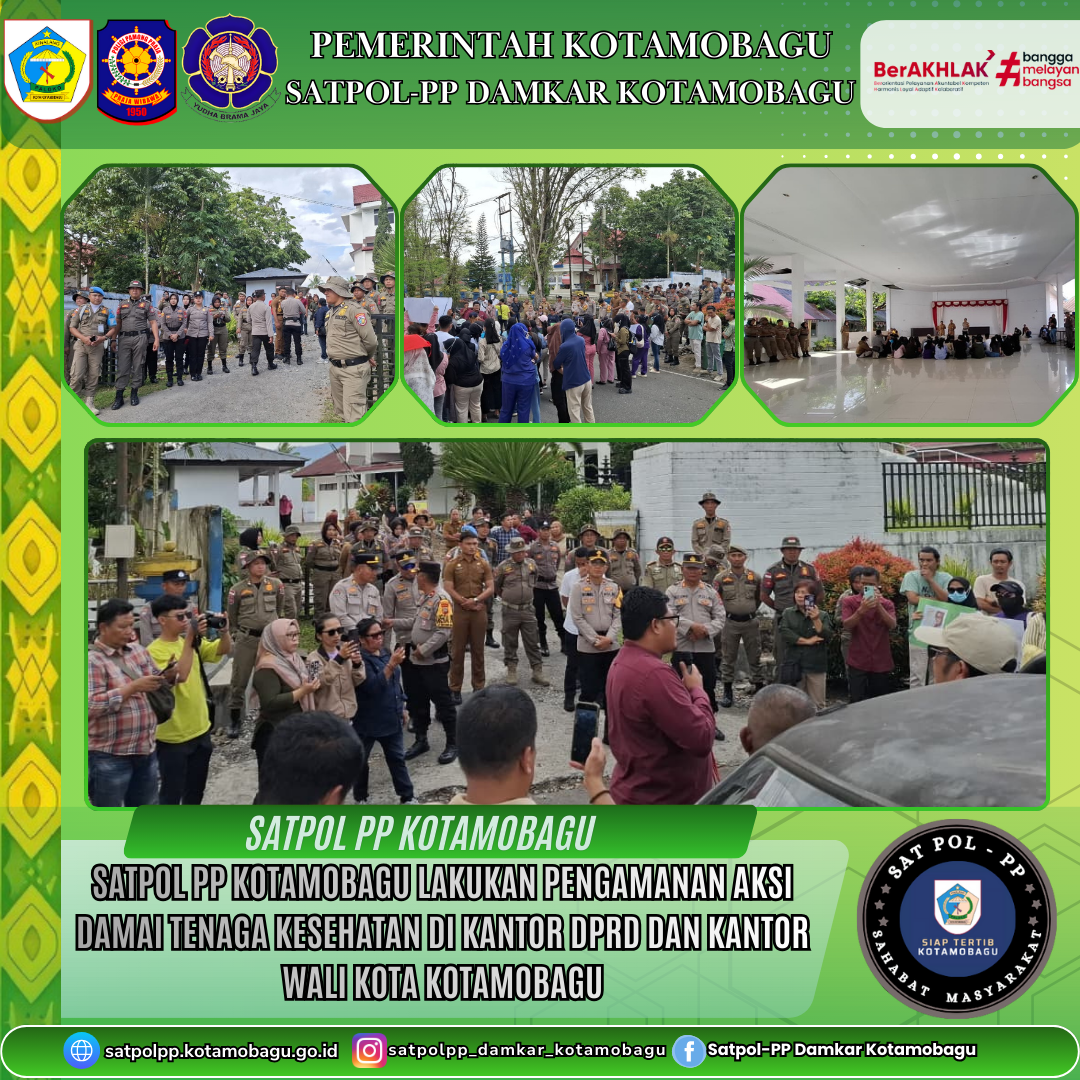 SATPOL PP KOTAMOBAGU LAKUKAN PENGAMANAN AKSI DAMAI TENAGA KESEHATAN DI KANTOR DPRD DAN KANTOR WALI KOTA KOTAMOBAGU Kotamobagu — Satuan Polisi Pamong Praja (Satpol PP) Kota Kotamobagu melaksanakan tugas pengamanan kegiatan Aksi Damai yang digelar oleh tenaga kesehatan RSIA Kasih Fatimah Kotamobagu, Selasa (25 November 2025). Aksi ini merupakan bentuk kepedulian dan solidaritas para tenaga kesehatan dalam menyuarakan pentingnya perlindungan hukum bagi tenaga kesehatan dalam menjalankan tugas pelayanan. Rangkaian Aksi Damai Aksi dimulai pada pukul 12.30 WITA dengan jumlah peserta sekitar 100 orang. Massa bergerak menuju beberapa lokasi, yaitu: Polres Kotamobagu Kantor DPRD Kota Kotamobagu Kantor Wali Kota Kotamobagu Dalam kegiatan tersebut, peserta aksi melakukan orasi damai, pembacaan pernyataan sikap, serta doa bersama sebagai bentuk aspirasi dan komitmen bersama dalam memperjuangkan keamanan dan perlindungan hukum bagi para tenaga kesehatan. Pengamanan oleh Satpol PP Kotamobagu Satpol PP Kota Kotamobagu menurunkan personel untuk melakukan pengamanan dan pengaturan situasi selama aksi berlangsung. Petugas memastikan jalannya kegiatan tetap tertib, aman, serta tidak mengganggu ketertiban umum dan arus lalu lintas di sekitar lokasi aksi. Pengamanan dilakukan dengan berkoordinasi bersama unsur kepolisian dan instansi terkait lainnya guna memastikan seluruh rangkaian aksi berjalan kondusif dari awal hingga selesai. Situasi Kondusif dan Terkendali Selama aksi berlangsung, situasi di lapangan terpantau aman dan terkendali. Peserta aksi menjalankan kegiatan dengan tertib sesuai rencana yang telah disampaikan oleh pihak penyelenggara. Satpol PP juga memberikan imbauan kepada peserta aksi untuk tetap menjaga ketertiban serta menghormati aktivitas masyarakat di sekitar lokasi. Komitmen Satpol PP Melalui kegiatan pengamanan ini, Satpol PP Kota Kotamobagu menegaskan komitmennya dalam mendukung setiap penyampaian pendapat di muka umum yang dilaksanakan secara damai, tertib, serta sesuai ketentuan peraturan perundang-undangan.